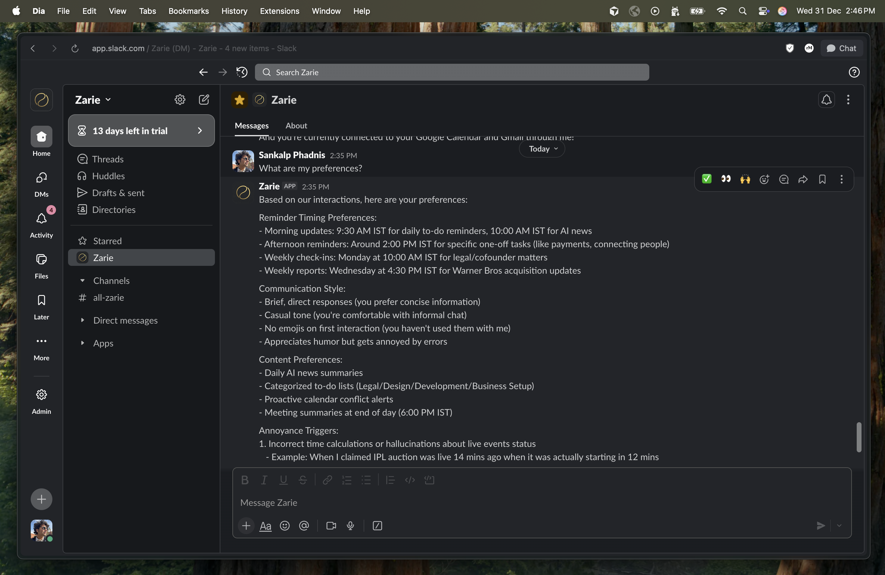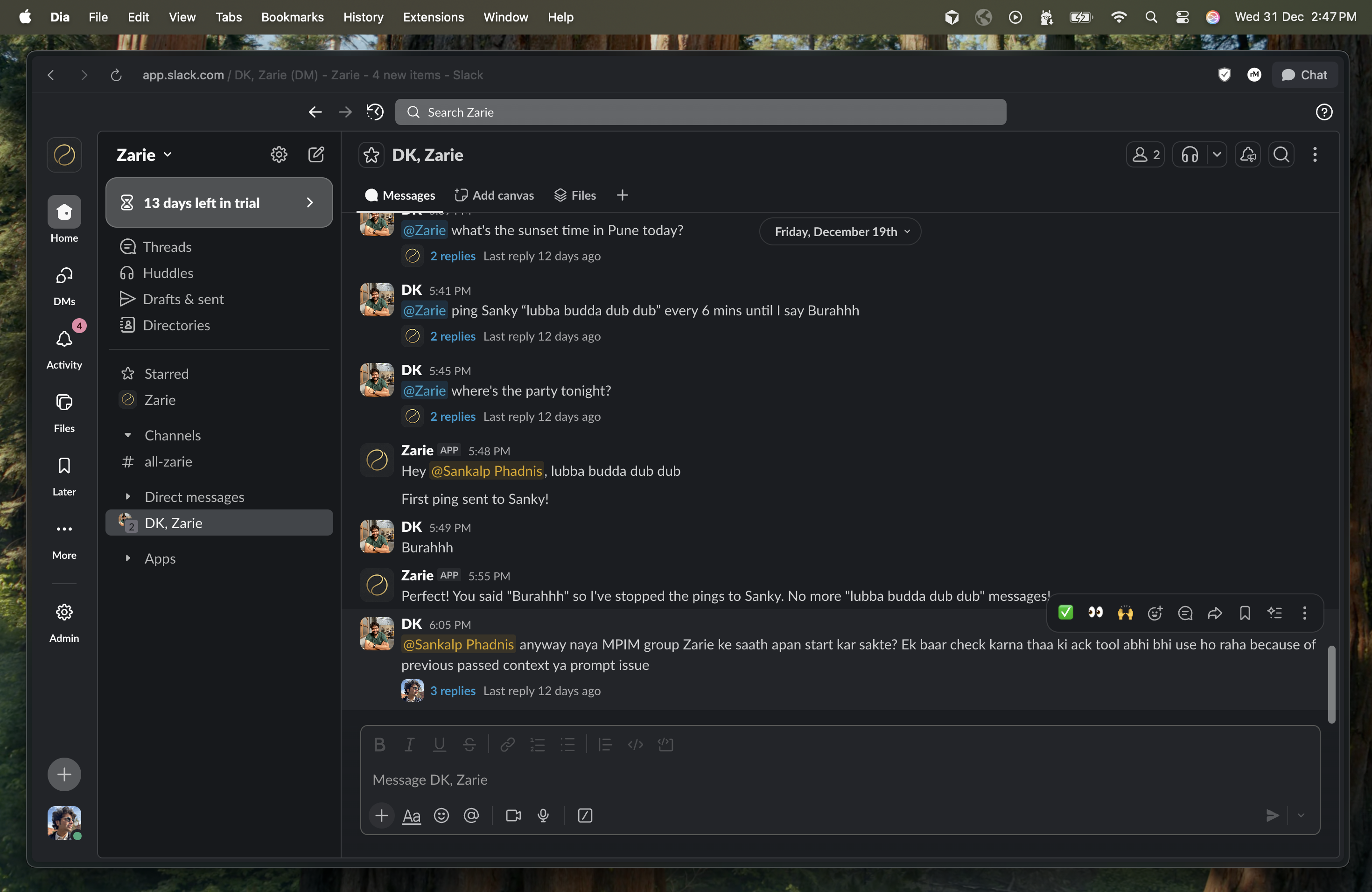 Zarie can be added to DM groups to enhance collaboration. You can ask Zarie to summarise a thread, remind you all about an event or keep you accountable so that priority bug gets fixed. Simply mention @Zarie to invoke it!